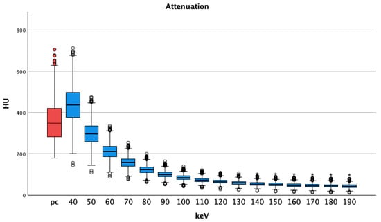 We showed that the pv energy threshold of 40 keV had significantly higher attenuation than the pc images of the arterial phase. This is in accordance with the research of Lennartz et al. [29], which was performed on a dual-layer spectral detector CT scanner. They showed higher attenuation in VMI without statistical significance; the increase in attenuation was comparable to our results but we saw higher absolute values for 40 keV in PCD-CT compared to dual layer spectral CT (e.g., aorta PCD-CT 470 ± 94 HU vs. dual layer spectral detector 369 ± 90 HU).