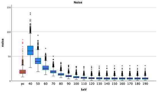 Compared to pc images, the noise in pv VMI showed lower values at the energy levels of 70 keV and above (Table 2). All t-tests showed statistically significant differences (p < 0.001 for all comparisons, lowest p was seen at VMI pv 70 keV 19.22 ± 4.81 vs. pc 19.95 ± 8.58, p = 0.022). Noise was highest at 40 keV, showing a steady decrease with increasing energy levels, see Figure 4.