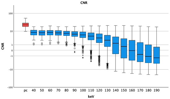 Median and interquartile ranges of contrast-to-noise ratio; they were highest for pc arterial phase, stable at lower energy levels and decreasing for higher thresholds (also with bigger interquartile ranges). A logarithmic scale was used for better visualization; pc = polychromatic (arterial); CNR = contrast-to-noise ratio; dots show aberrant values, asterisks are more aberrant values.