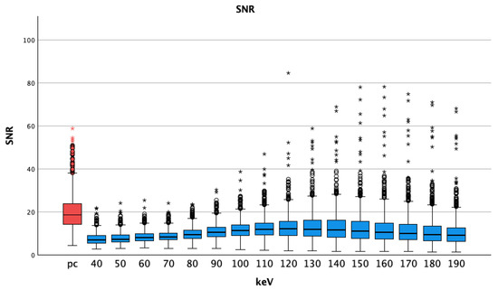 Median and interquartile ranges of signal-to-noise-ratio; pc arterial phase shows higher values compared to the virtual monoenergetic images; SNR = signal-to-noise-ratio; pc = polychromatic (arterial), dots show aberrant values, asterisks are more aberrant values.
