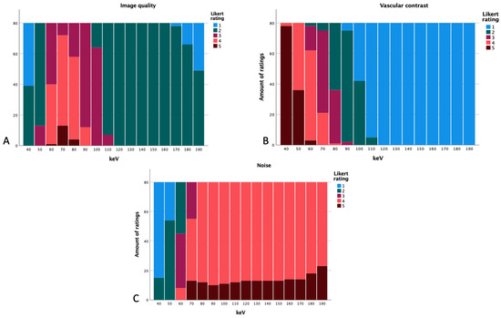 Likert ratings based on the energy level regarding image quality (A), vascular contrast (B), and subjective noise (C).