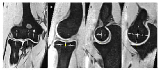 Two examiners, both elbow surgeons with over 10 years of clinical experience, independently evaluated all MR images under the supervision of a musculoskeletal radiologist (Y.O.) with more than 20 years of clinical experience. We used Osirix MD (version 14.0 Pixmeo©, Bernex, Switzerland) to interpret the images and obtain multiplanar reconstructed images. The first author reconstructed all the sagittal and coronal images parallel to the longitudinal axis of the humerus. The examiners freely enlarged and adjusted the grayscale contrast of the images during assessments for optimal visualization of the structures. All MR images were randomly numbered to reduce potential examiner bias. Even with MRI, examiner-related measurement errors may occur. Therefore, both examiners measured each parameter twice to evaluate intraobserver correlations. The second assessment was conducted at least two weeks after the first assessment.