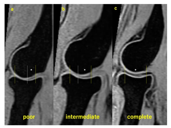 On the sagittal images with which we measured the JSWs, we graded the HACOV using the same three-point scale used in a previous study [13]. Grading was performed on the sagittal image with measured joint space widths. Visibility was graded as poor when <50% of the humeral articular cartilage outline was visible in the range facing the opposing articular cartilage (Figure 3a). When ≥50% but <100% of the humeral articular cartilage outline was visible, visibility was graded as intermediate (Figure 3b). Visibility was graded as complete when 100% of the humeral articular cartilage outline was visible (Figure 3c).