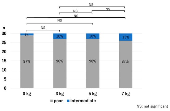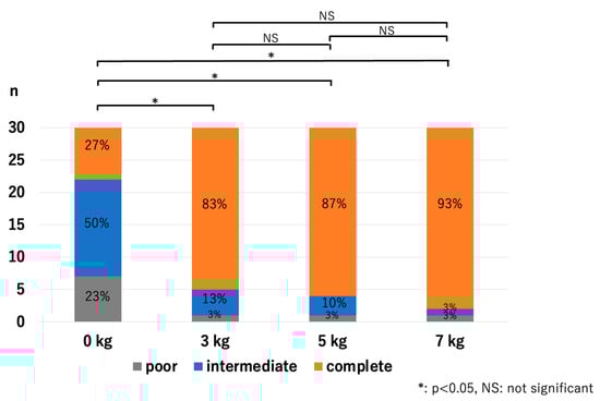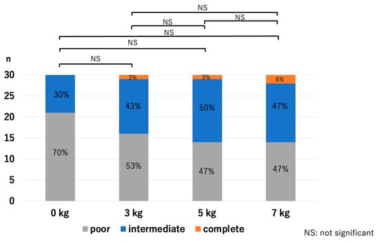 In the RCJ, the JSW significantly increased with the application of traction. However, there were no significant differences among the traction weights used: p < 0.01 for 0 kg vs. 3 kg, p < 0.01 for 0 kg vs. 5 kg, p < 0.01 for 0 kg vs. 7 kg, p = 0.13 for 3 kg vs. 5 kg, p = 0.06 for 3 kg vs. 7 kg, and p = 0.63 for 5 kg vs. 7 kg (Figure 5). The HACOV also significantly increased with the application of traction. The rate of RCJ assessments evaluated as complete on conventional MRI was 27% (8/30 assessments). The rate was 83% (25/30 assessments, p < 0.01) for 3 kg traction, 87% (26/30 assessments, p < 0.01) for 5 kg traction, and 93% (28/30 assessments, p < 0.01) for 7 kg traction. However, no significant differences were observed between the different traction weights used: p = 0.73 for 3 kg vs. 5 kg, p = 0.248 for 3 kg vs. 7 kg, and p = 0.410 for 5 kg vs. 7 kg (Figure 6).