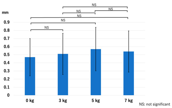 At the LUHJ, the JSW did not show a significant difference with the application of traction: p = 0.51 for 0 kg vs. 3 kg, p = 0.14 for 0 kg vs. 5 kg, p = 0.23 for 0 kg vs. 7 kg, p = 0.26 for 3 kg vs. 5 kg, p = 0.55 for 3 kg vs. 7 kg, and p = 0.62 for 5 kg vs. 7 kg (Figure 7). The HACOV showed no significant improvement with the application of traction either: p = 0.17 for 0 kg vs. 3 kg, p = 0.06 for 0 kg vs. 5 kg, p = 0.06 for 0 kg vs. 7 kg, p = 0.63 for 3 kg vs. 5 kg, p = 0.55 for 3 kg vs. 7 kg, and p = 0.89 for 5 kg vs. 7 kg (Figure 8).