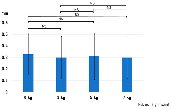 At the MUHJ, the JSW did not show a significant difference with the application of traction: p = 0.54 for 0 kg vs. 3 kg, p = 0.81 for 0 kg vs. 5 kg, p = 0.57 for 0 kg vs. 7 kg, p = 0.65 for 3 kg vs. 5 kg, p = 0.92 for 3 kg vs. 7 kg, and p = 0.76 for 5 kg vs. 7 kg (Figure 9). No volunteer was graded complete on the HACOV, and it showed no significant improvement with the application of traction: p = 0.31 for 0 kg vs. 3 kg, p = 0.31 for 0 kg vs. 5 kg, p = 0.17 for 0 kg vs. 7 kg, p = 1.0 for 3 kg vs. 5 kg, p = 0.69 for 3 kg vs. 7 kg, and p = 0.69 for 5 kg vs. 7 kg (Figure 10).