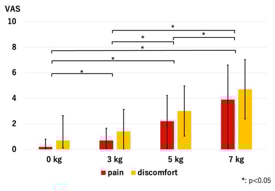 Pain and discomfort values reported by volunteers. Scores significantly increased as we used heavier traction weights (VAS—visual analog scale).