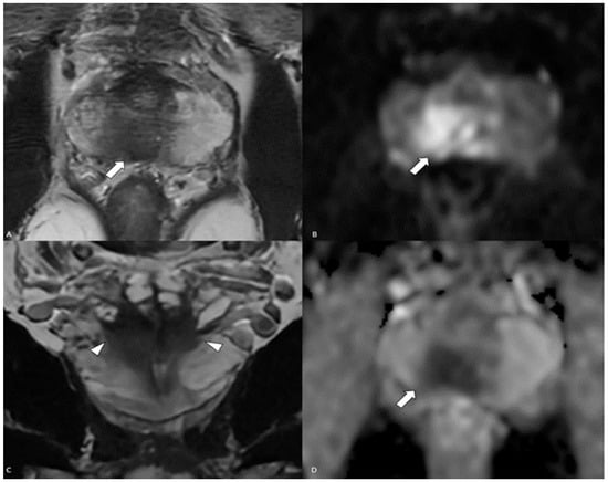 MRI of the prostate: (A) axial T2 demonstrates a posterior peripheral-zone T2-hypointense lesion (white arrow) with (B,D) restricted diffusion (white arrows), and (C) coronal T2 demonstrates seminal vesicle invasion (white arrowheads).