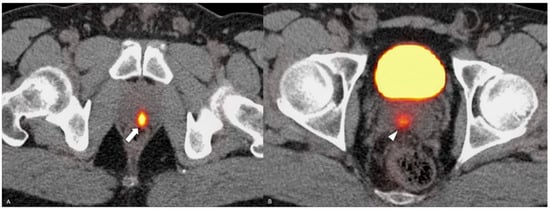 PSMA PET/CT. Part (A)—radiotracer uptake is demonstrated in the posterior prostate (white arrow). Part (B)—tumor is extending into the seminal vesicles (white arrowhead).