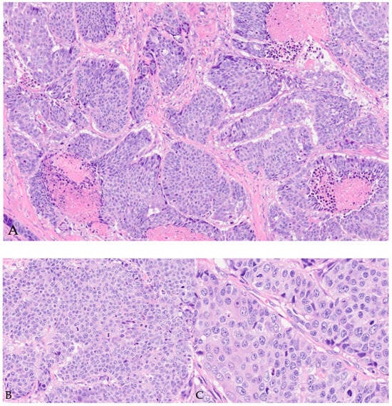 Microscopic examination of prostatectomy specimen (A,B). H&E staining image with extensive squamous component. (Magnification: 10× (A), 20× (B) and 40× (C)).