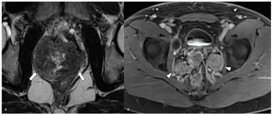 MRI of the pelvis: (A) axial T2 demonstrates a large heterogeneously hypointense lesion in the prostatic bed (white arrows). (B) Axial contrast-enhanced T1 fat-saturated sequence shows bilateral pelvic adenopathy (white arrowheads).