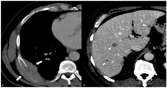 Contrast-enhanced CT—(A) axial post-contrast CT of the chest shows an expansile right 8th rib mass with a subpleural component (white arrows). (B) Axial post-contrast CT of the abdomen shows multiple small ill-defined liver lesions (white arrowheads).