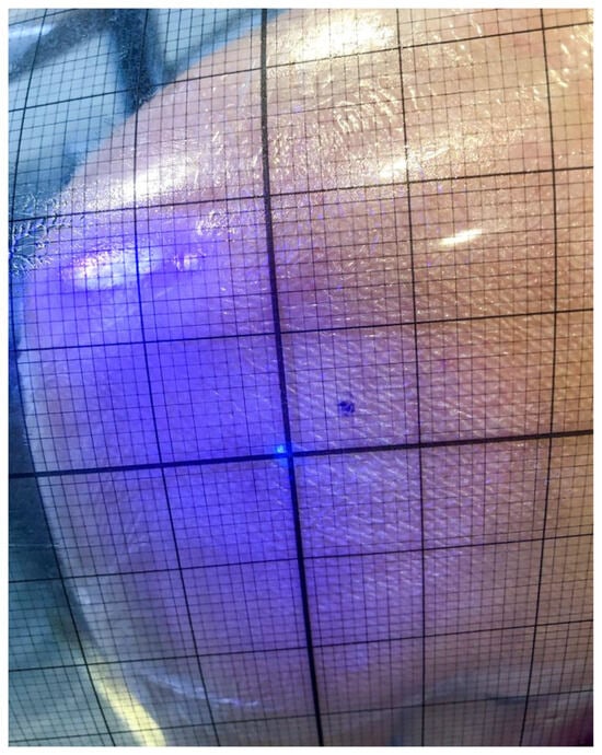 First, the dorsal joint gap was defined by a DEGUM- and DVSE (German Society for Shoulder and Elbow)-certified shoulder–elbow surgeon experienced in both arthroscopy and sonography by visualization using sonography, conducted multiple times to ensure the correct position. This point was defined as the ideal point (IP). It was marked using a UV pen and covered with transparent foil. Four quadrants were defined and numbered using a coordinate system starting from the IP, while the craniolateral quadrant was defined as 1, the caudolateral quadrant as 2, the caudomedial quadrant as 3, and the craniomedial quadrant as 4. Furthermore, a rectangular corridor above the IP, in which puncture of the joint could be performed, as well as safe insertion of a trocar for arthroscopy, was defined, located between 1 cm above and 2 cm below, as well as 0.5 cm to the left and right, of the IP (Figure 1).