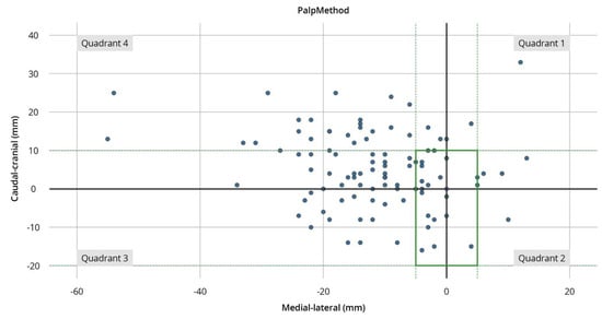 The mean deviation from the IP was 17.12 mm (±9.95 mm) with a maximum deviation of 59.51 mm after palpation, while ultrasound-guided estimation deviated on average by 10.29 mm (±6.09 mm) with a maximum deviation of 30.23 mm. Regarding the defined quadrants, most points estimated by palpation (pdp) were located in the fourth quadrant (64%) and the fewest in quadrant 2 (2%) (Figure 3 and Figure 4).
