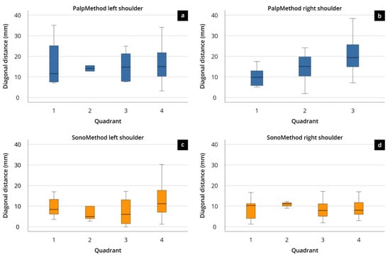 Binary and categorical baseline parameters are expressed as absolute numbers and percentages. Continuous data are expressed as median and interquartile range (IQR), or as mean and standard deviation (SD). Data distribution was tested using the Shapiro–Wilk test. The mean values of the diagonal of the palpatory method and the sonographic method were compared. Statistical parameters were calculated for both methods for the left and right shoulders, and analyses of variance were performed. As the variables were not normally distributed, categorical parameters were compared using Fisher’s exact test and continuous parameters using the Mann–Whitney test. Pearson’s correlation coefficient was determined, and a Maloney and Rastogi test was performed. Precision differences were represented by a Bland–Altman plot. The quadrants were compared descriptively and visualized graphically by boxplots. A chi-squared test checked the error variance of the quadrants. p values < 0.05 were considered statistically significant.