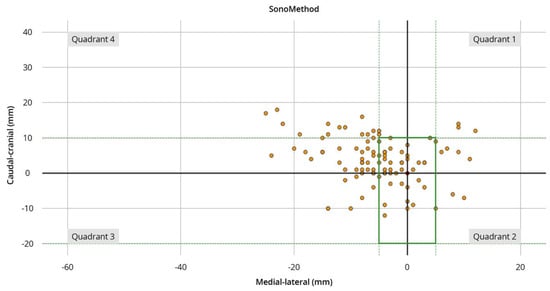 Similarly, in the ultrasound group, most sdps were identified in quadrant 4 (61%) and the fewest in quadrant 2 (8%). In total, 22% of points defined by palpation were in the defined corridor, whereas 42% of points estimated by ultrasound-guided examination were located correctly. Inspection of the quadrants within the defined corridor showed that sdps were located with 3% in quadrant 1, 2% in quadrant 2, 8% in quadrant 3, and 10% in quadrant 4. Sdps were located with 8% in the first, 6% in the second, 9% in the third, and 19% in the fourth quadrant (Figure 4 and Figure 5).