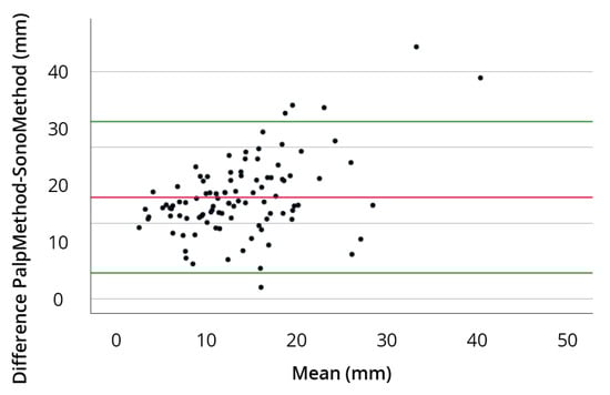The mean difference between the palpatory and ultrasound-guided approaches was 9.045 (±8.268) in favor of the ultrasound-guided technique, with a maximum deviation of 46.52 mm from the IP. The mean difference between both approaches was significant (p < 0.001). A relevant difference between left and right shoulder was not measurable. A Bland–Altman plot was generated for graphical evaluation, which showed comparable results; however, the ascending course of the regression line showed that there were big differences between both methods (Figure 6).