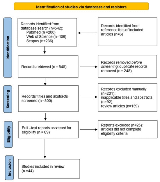 The initial database search yielded 542 results. All records were added to a citation manager software and prior to screening, duplicates were removed, thus, leaving 295. Since the abstracts and titles of 92 of the retrieved articles were not pertaining to SSc and/or DNA methylation and histone PTMs, they were excluded. Another 139 review articles and letters to the editor were also removed. The remaining 69 full-text articles were assessed for eligibility based on the predefined inclusion and exclusion criteria, and of them, 25 articles were excluded because they did not meet the criteria—the research was conducted in multiple autoimmune diseases simultaneously and did not contain sufficient information on SSc, or they were not analyzing DNA methylation and histone PTMs. A total of 39 articles met the eligibility criteria and were included in the scoping review. Additionally, we manually screened the reference lists of the included articles and identified 6 relevant titles. After full-text assessment, 1 was excluded, thus, leaving 44 articles to be included in the final review (Figure 1).