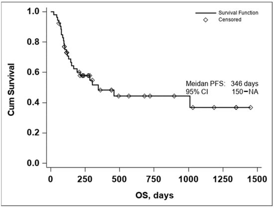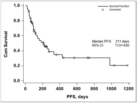The median PFS was 211 days with a 95% CI (113–430), as seen in Figure 2. In both the Kaplan–Meier curves, there can be noticed an aggregate of events occurring around the 250-day mark for OS and the 200-day mark for PFS, with an important number of subjects maintaining the response to treatment if no disease progression or death occurred until the aforementioned time marks. In conclusion, these data seem to indicate that if a response to treatment is observed past the 250-day mark, a high chance of maintaining this response for an extended period exists.