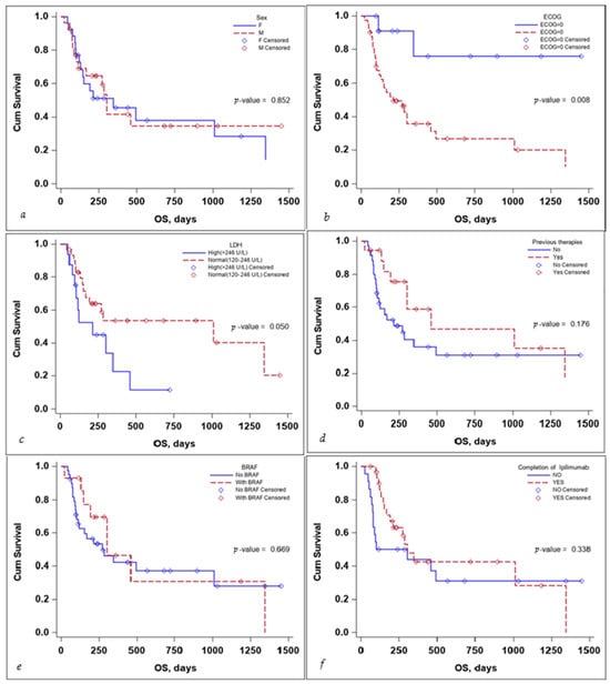 Kaplan–Meier curve for OS according to (a) sex, (b) ECOG, (c) LDH levels at the start, (d) previous treatment, (e) BRAF status, and (f) completion of treatment.