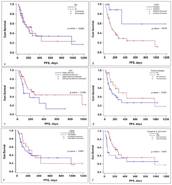 Kaplan–Meier curve for PFS according to (a) sex, (b) ECOG, (c) LDH levels at the start, (d) previous treatment, (e) BRAF status, and (f) completion of treatment.