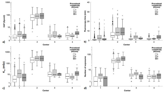 Patient radiation exposure quantities in all ERCP procedures (thus, containing data both from non-PSC and PSC procedures) according to the 3-point HOUSE complexity grading scale. (a) KAP, (b) fluoroscopy time, (c) Ka,r, and (d) number of exposures varied significantly between the participating centers. A logarithmic scale is used on the y-axis for KAP, Ka,r, and number of exposures to better delineate the changes at low dose levels and low number of exposures. In the boxplots, circles and asterisks denote outliers and extreme cases, respectively. Outliers are defined as data points that fall beyond 3 standard deviations from the mean. Extreme cases are identified as data points lying outside of 1.5 times the interquartile range above the third quartile or below the first quartile in the boxplot.