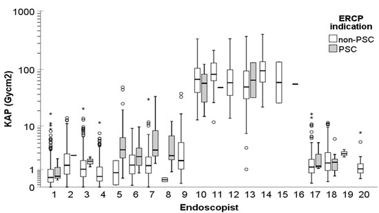 KAP of the non-PSC and PSC ERCP procedures across the endoscopists (the endoscopists #1–9 were from Center 1, #10–16 from Center 2, #17 from Center 3, and #18–20 from Center 4, respectively). A logarithmic scale is used on the y-axis to better delineate the changes at low dose levels. In the boxplots, circles and asterisks denote outliers and extreme cases, respectively. Outliers are defined as data points that fall beyond 3 standard deviations from the mean. Extreme cases are identified as data points lying outside of 1.5 times the interquartile range above the third quartile or below the first quartile in the boxplot.