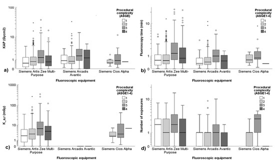 Patient radiation exposure quantities in all ERCP procedures (thus, containing data both from non-PSC and PSC procedures) according to the 4-point ASGE complexity grading scale. (a) KAP, (b) fluoroscopy time, (c) Ka,r, and (d) number of exposures varied significantly between the participating centers. A logarithmic scale is used on the y-axis for KAP, Ka,r, and number of exposures to better delineate the changes at low dose levels and low number of exposures. In the boxplots, circles and asterisks denote outliers and extreme cases, respectively. Outliers are defined as data points that fall beyond 3 standard deviations from the mean. Extreme cases are identified as data points lying outside of 1.5 times the interquartile range above the third quartile or below the first quartile in the boxplot.
