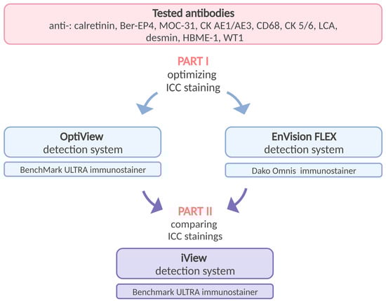 The antibodies against calretinin, Ber-EP4, MOC-31, CK AE1/AE3, CK 5/6, CD68, LCA, desmin, HBME-1, and WT1 (Table 1), which are most frequently used diagnostic markers in our routine cytopathological practice, were selected for the validation study, which consisted of two parts (Figure 1). In the first part, we tested different parameters (antibody dilution and incubation time, antigen (target) retrieval, amplification, and counterstaining) for OV and EnV detection systems to select a unique optimal staining protocol by comparing the staining results with routinely used iV staining protocols at the IOL on five different positive and negative samples for each antibody separately. The protocol that provided the best results was selected for further evaluation in the second part of the study. The selected protocols were validated on 10 positive and 10 negative samples with known diagnoses according to previously published validation procedures [12,20]. The results obtained with the OV and Env detection systems were compared with the results of the iV detection system used in routine diagnostics. The internal IOL and UK NEQAS (NEQAS) scoring systems were used to evaluate the ICC staining results and for further statistical analysis using intraclass correlation and kappa statistics.