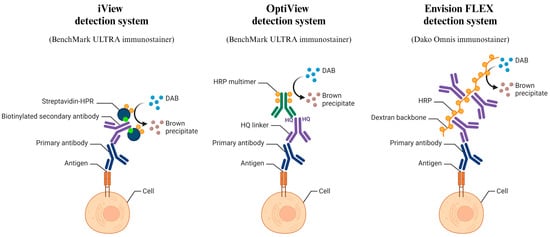 The iView (iV), OptiView (OV), and EnVision FLEX (EnV) detection systems use different mechanisms. iV is based on a biotin–streptavidin reaction, OV uses HQ linkers, and EnV uses a dextran backbone, all leading to the formation of the final diaminobenzidine (DAB) precipitate as a positive staining reaction. iV and OV detection systems are specifically designed for the BenchMark ULTRA, while EnV is optimized for the Dako Omnis immunostainer. Created with Biorender.com.