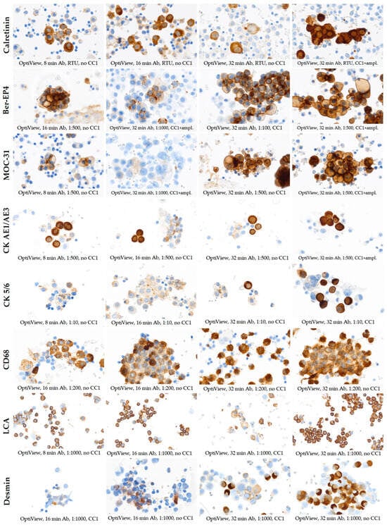 However, our practice through the study showed that combining different parameters within protocols using different detection systems could lead to satisfactory ICC staining protocols for routine cytopathological practice, depending on the available immunostaining equipment. Furthermore, our long experience with ICC at the IOL [26] allowed us to properly validate the selected optimal protocols with each antibody used in the study in accordance with the validation protocols published previously. Good optimization and validation of protocols are essential to maintain the quality, reliability, and reproducibility of staining results in clinical practice and to facilitate the process of standardization in the near future [20,27,28].