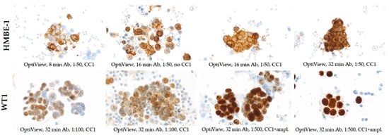 Staining with the OV detection system for calretinin provided non-satisfactory results if additional steps of target retrieval were not included in the staining protocol regardless of the antibody incubation time (8, 16, or 32 min). However, including a target retrieval step with the CC1 solution minimized the nonspecific staining of the samples, whereas an amplification step improved the intensity of the positive stained cells. Similarly, the most optimal staining results of Ber-EP4 and MOC-31 were achieved under the same protocol conditions as for calretinin. The optimal staining intensity and the absence of background staining of CK AE1/AE3, CK 5/6, and HBME-1 were achieved using the protocol with CC1 target retrieval accompanied by 16 min, 32 min, and 32 min antibody incubation time, respectively. For CD68, LCA, and desmin detection, 32 min antibody incubation without additional steps was chosen as the optimal protocol condition. For WT1 detection, the amplification step optimized the staining intensity and specificity of the previously routinely used protocol with target retrieval with the CC1 solution. Target retrieval using CC2 did not yield satisfactory results for any of the test protocols and antibodies. The selection of optimal protocol conditions is provided in Table 2 (bolded parameters).