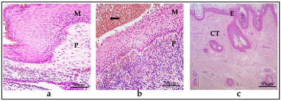 The control group comprised deep, intact external ear canal skin, consisting of an unchanged stratified squamous epithelial layer and non-inflammatory subepithelial connective tissue (Figure 1a–c).