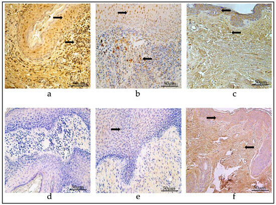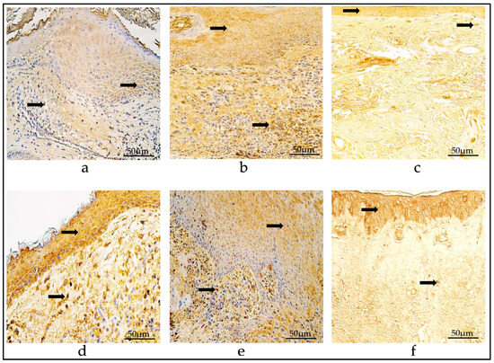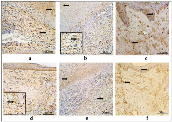 In the control group, the mean numbers of MMP-2-positive cells were few (+) in the epithelium and the connective tissue. The relative numbers varied from zero (0) to numerous (+++) in the epithelium, and from an occasional amount (0/+) to few (+) positive cells in the visual field in the connective tissue. On average, MMP-9-positive cells in the epithelium were few (+) and occasional to few (0/+-+) in the connective tissue, ranging from zero (0) to few to a moderate (+/++) amount of factor-containing cells (Figure 8c,f).