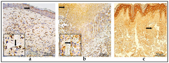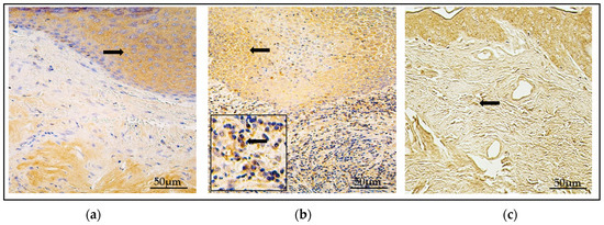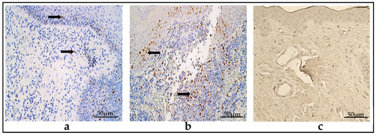 The results section is divided into subsections. In each subsection, the results of analyzed tissue factors are described. The same results are summarized in Table 2 and Table S1 (Supplementary Materials). Furthermore, the microphotographs are presented as an example of each cell marker. At the end of the results section, statistically drawn results are summarized in Table 3, Table 4 and Table 5.