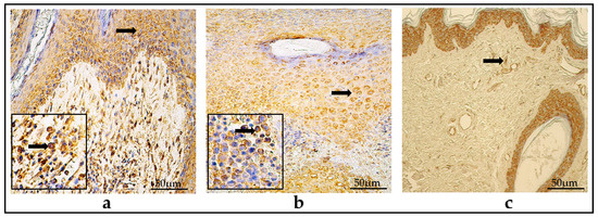 (a–c) Immunohistochemical micrographs. (a) Child cholesteatoma. A few-to-moderate number of VEGF-positive cells in the matrix (arrow) and a moderate amount in the perimatrix (magnification + arrow—positive endotheliocyte). The arrow in the perimatrix points out positive endotheliocyte. (b) Adult cholesteatoma. Numerous-to-abundant amount of VEGF-positive cells in matrix (arrow) and a moderate amount in the perimatrix (magnification + arrow—positive endotheliocyte). (c) Skin. Numerous VEGF-positive cells in the epithelium and few (arrow) in the connective tissue. VEGF IHC, ×200.
