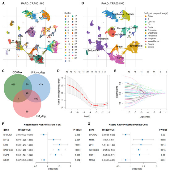 Identification of TEX-related gene signature in PACA. (A) The UMAP plot in PAAD-CRA001160 scRNA-seq dataset from TISCH2 database. These cells were distributed in 33 clusters. (B) The UMAP plot presented by cell type. The CD8TEX mainly consisted of cells from cluster 6 and cluster 15. (C) Intersection among CD8TEX-related genes and DEGs selected by three methods (DESeq2, edgeR, and limma R packages) with prognostic values in both univariate Cox regression and Kaplan–Meier survival analysis. This intersected Venn plot was generated using the jvenn online tool, which is an interactive Venn plot viewer (https://jvenn.toulouse.inra.fr/app/example.html, accessed on 1 January 2024). (D,E) The LASSO coefficient profiles generated by 49 prognostic TEX-related DEGs using the survival (v3.3.1) and glmnet (v4.1-7) R packages. The log(λ).min was used to select the optimal gene sets, and a total of 14 TEX-related DEGs were selected for stepwise variable selection process to obtain the best candidate for Cox’s proportional hazards model. Six TEX-related DEGs were finally utilized by stepwise variable selection process with the My.stepwise (v0.1.0) R package. (F,G) Univariate and multivariate Cox regression analyses of the six TEX-related DEGs confirmed the significant association with OS in PACA patients from TCGA using survival (v3.3.1) and survminer (v0.4.9) R packages. The forest plot was drawn with the forestplot (v3.1.1) R package.