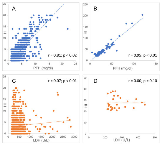 3.2. Correlations between the HI and PFH Levels and Plasma LDH Levels