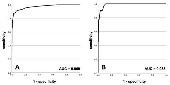 ROC curves: (panel A) for the whole cohort; (panel B) for patients with ECMO or mechanical circulatory support.