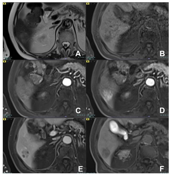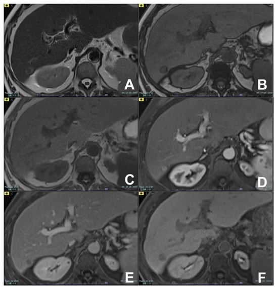 (A–F): HCC with multi-arterial phase. On T2w (A), a slight hyperintense lesion is appreciated at the VI segment, which appears hypointense on T1w (B). The lesion is hypervascular (C) and better appreciated in the second arterial acquisition (D) with washout at the venous phase (E). At the hepatobiliary phase after liver-specific MR contrast agent (Multihance, Bracco), the lesion is hypointense (F).
