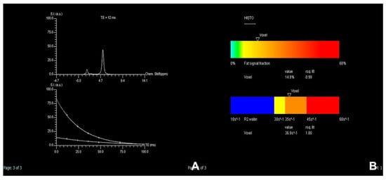 (A,B) Fat/Iron quantification. (A) Top: spectral separation of iron and fat. Bottom: signal decay in the different TEs. (B) Top: fat fraction (14.8%). Bottom: R2water (36.9 SEC -1), expression of iron deposit.