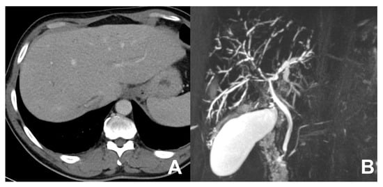 (A,B) PSC, comparison of CT and MRCP. With CT (A), only some slight ectasia of peripheral biliary ducts can be appreciated. With MRCP (B), the multiple stenosis of biliary ducts are clearly visible.