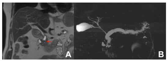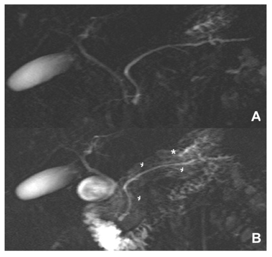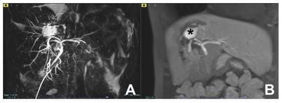 Moreover, by using liver-specific MR contrast agents during the biliary phase, with a high-resolution 3D T1 sequence and MIP reformation, it is possible to obtain a functional visualization of the choledochus and biliary ducts up to the second order. With this technique, it is possible to assess the functionality of biliary anastomosis, the passage of the bile in the duodenum, which can be impaired in the case of sphincter of Oddi dysfunction (SOD) or to confirm a bile leak, either after trauma or surgery [6,7,8] (Figure 6).