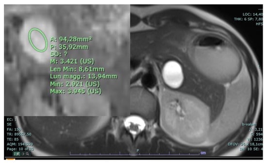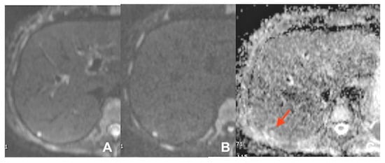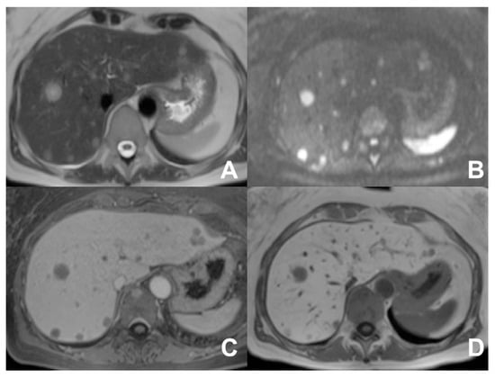 - Identification of focal liver lesions: DWI with a b value < 100 shows the highest sensitivity in the identification of focal liver lesions [10] (Figure 7). DWI has the best sensitivity to detect liver metastases, especially small lesions. A combination of DWI and contrast-enhanced T1w images shows the best performance in the detection of liver lesions compared to each sequence alone [11]. In patients who cannot receive a gadolinium-based contrast agent (GBCA), DWI is a reasonable alternative.