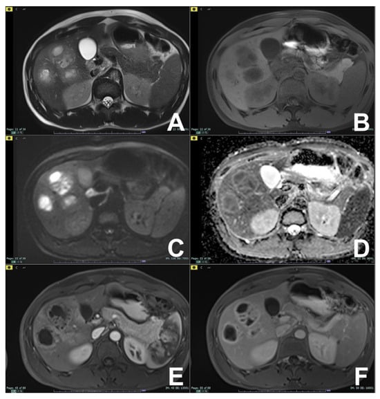 - Chan, J.H.M.; Tsui, E.Y.K.; Luk, S.H.; Fung, A.S.L.; Yuen, M.K.; Szeto, M.L.; Cheung, Y.K.; Wong, K.P.C. Diffusion-weighted MR imaging of the liver: Distinguishing hepatic abscess from cystic or necrotic tumor. Abdom. Imaging 2001, 26, 161–165. [Google Scholar] [CrossRef] [PubMed]