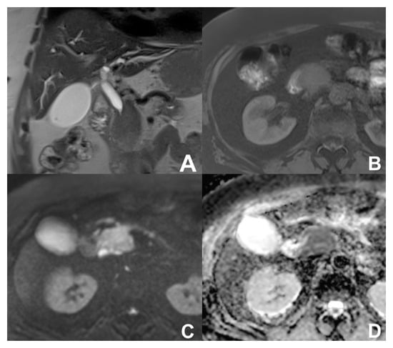 DWI play a crucial role in the identification of worrisome feature in pancreatic cystic lesions and, according to some authors, high b-value DWI may help in the detection and classification of solid lesions in IPMN [31,32] (Figure 18), thus contributing to the differentiation between benign and malignant IPMNs [33]. On unenhanced MRI, DWI with MRCP could improve the diagnosis of malignant IPMN with a better prediction of invasive IPMN [34,35]. According to some authors, DWI can be useful in differentiating serous from mucinous cystic lesions; a threshold value of 3 × 10 − 3 mm2/sec on the ADC maps could help to distinguish mucinous from serous lesions (the latter with lower ADC values) with an accuracy rate of 77–81% and a good correspondence with anatomo-pathological outcomes [36,37] (Figure 19 and Figure 20). Finally, DWI is a non-invasive tool that allows the detection of infection in acute pancreatitis-associated collections; an infected collection shows restricted diffusion and ADC values in the central parts significantly different from non-infected groups [38]. Finally, DWI offers important information in the assessment of the onset of small pancreatic carcinoma by using short protocols [39].