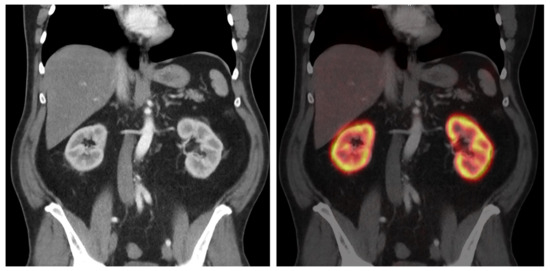 Prostate-specific membrane antigen (PSMA) ligand PET/CT is a relevant and specific multimodal imaging modality for prostate cancer. Its scientific and clinical impact on tumor staging, tumor recurrence, and preparation of radioligand therapy has increased in recent years [1,2,3]. Radioactively labeled ligands bind to PSMA, a protein also known as glutamate carboxypeptidase II, predominantly expressed by prostate cancer cells. In addition, radiopharmaceuticals are also distributed within various organs and compartments, as well as a few other tumor entities [4,5]. Contrary to its name, PSMA is also expressed in other tissues, although usually at lower levels. Since the first use of PSMA ligands in PET/CT imaging, their biodistribution has been evaluated [6,7,8,9]. The organs with the highest uptake are the kidneys, which show a specifically appearing enhancement within the renal cortex (Figure 1). In general, radiotracer accumulation in the kidney is sometimes advantageous, e.g., in renal function scintigraphy, but often disadvantageous in nuclear medicine, e.g., in tumor diagnostics or radioligand therapies. Also, renal failure, especially chronic kidney disease (CKD), is common, in particular, in elderly patients, who are also more often affected by tumor diseases such as prostate cancer.
