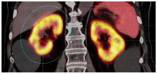 The collection of study-specific parameters was carried out using the dedicated imaging software Syngo.via (Version VB 40, Siemens Healthineers). To avoid inter-observer variability, one examiner performed all assessments. Image analysis was performed without knowledge of the patient’s renal function. Measurements took place either manually or via computer-assisted contouring methods. The standard uptake value (SUV), as a typical measurement on PET/CT imaging for quantifying radiopharmaceutical uptake, was calculated, and body weight was adjusted. The maximum value (SUVmax) was determined by a spherical volume of interest (VOI) at the place of visually highest uptake. The average value (SUVmean) of the renal cortex was manually determined by three identical VOI of 0.5 cm diameter at the upper kidney pole, at the lateral aspect in the middle of the kidney, and at the lower kidney pole. The arithmetical mean of the three SUVmean was calculated.