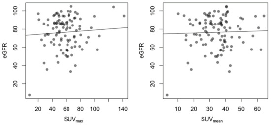 Manually measured uptake was distinctly variable, with an average SUVmax of 58.4 ± 21.2 (range 5.9–144.7) and SUVmean of 34.3 ± 12.6 (range 0.5–99.9). Both parameters did not show a correlation with the eGFR (Figure 3).
