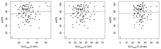 Comparison between eGFR in mL/min/1.73 m2 and SUV with linear regression. R2 for SUVmean of 50% contouring threshold (IC 50%) was 0.006; p = 0.441. R2 for SUVmean of 30% contouring threshold (IC 30%) was 0.004; p = 0.518. R2 for SUVmean contouring threshold SUV 20 (IC 20 abs.) was 0.001; p = 0.754.